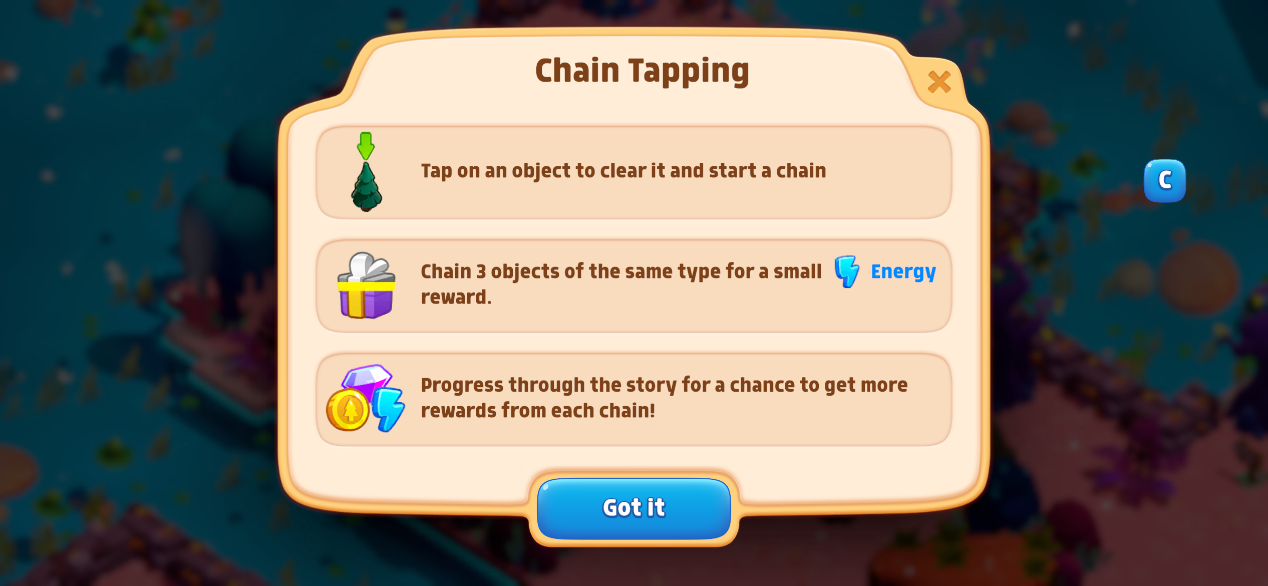 You can gather energy by exploring islands and opening energy chests, as well as continuously completing chains, by tapping three consecutive objects of the same type.